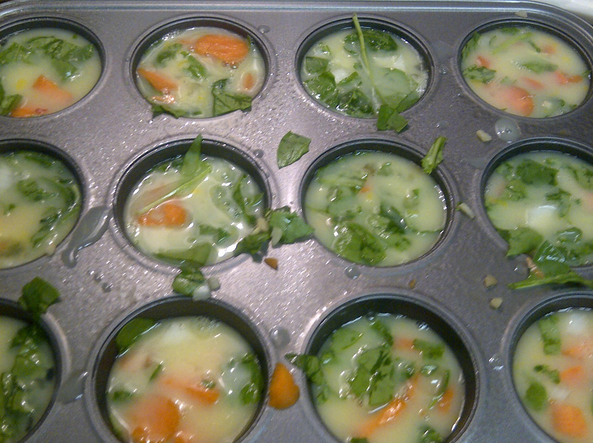 I also made egg muffins to eat for my breakfast this week. (This idea is taken from Oxygen Magazine.) I used 16 ounces of egg whites and four whole eggs. The veggies are optional and you can use any kind you want. You can also add in ground meat. First, I mixed the eggs together in a large bowl. I then chopped up a carrot, shredded some spinach and mixed them together with garlic cloves. I took a 12 muffin tin and sprayed with olive oil while pre-heating the oven to 375 degrees.